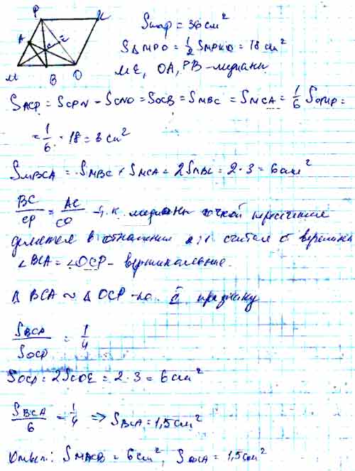 Для того чтобы дать полноценный ответ, был привлечен специалист, который хорошо разбирается требуемой тематике "ЕГЭ (школьный)". Ваш вопрос звучал следующим образом: Точки А и В — середины сторон МР и МО параллелограмма МРКО. Прямые ОА и РВ пересекаются в точке С. Найдите площади четырехугольника МАСВ и треугольника ABC если площадь параллелограмма равна 36 см2.