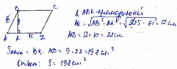 Для того чтобы дать полноценный ответ, был привлечен специалист, который хорошо разбирается требуемой тематике "ЕГЭ (школьный)". Ваш вопрос звучал следующим образом: Найдите площадь параллелограмма ABCD, если АВ = 15 см, ВК = 9 см, DK = 10 см, где точка К лежит на стороне AD и ВК _I_ AD.