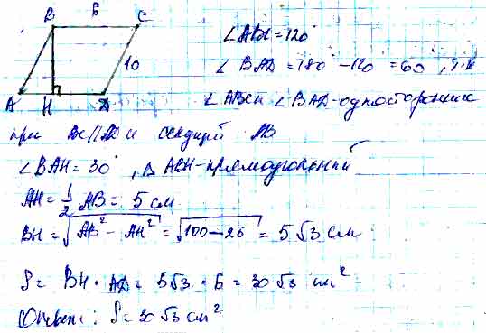 Для того чтобы дать полноценный ответ, был привлечен специалист, который хорошо разбирается требуемой тематике "ЕГЭ (школьный)". Ваш вопрос звучал следующим образом: Определите площадь параллелограмма ABCD, если: ВС = 6 см, CD = 10 см, ∠ABC = 120°.