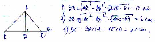Для того чтобы дать полноценный ответ, был привлечен специалист, который хорошо разбирается требуемой тематике "ЕГЭ (школьный)". Ваш вопрос звучал следующим образом: К прямой а проведены наклонные АВ = 17 см, АС = 10 см и перпендикуляр AD = 8 см. Найдите: 1) BD; 2) CD; 3) ВС.
