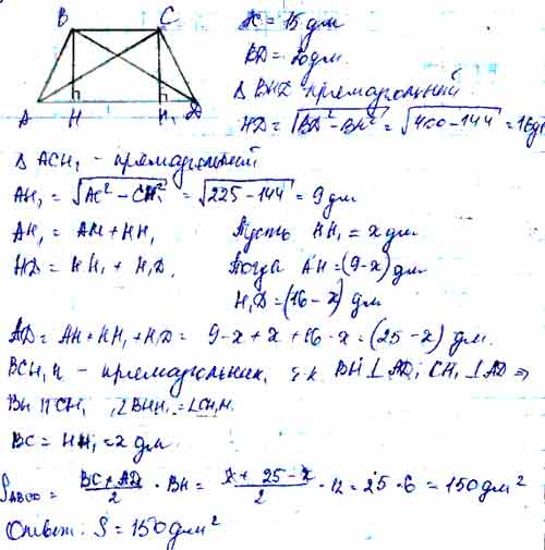 Для того чтобы дать полноценный ответ, был привлечен специалист, который хорошо разбирается требуемой тематике "ЕГЭ (школьный)". Ваш вопрос звучал следующим образом: В трапеции высота равна 12 дм, диагонали равны 15 дм и 20 дм. Найдите площадь трапеции.
