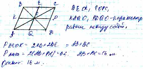 Для того чтобы дать полноценный ответ, был привлечен специалист, который хорошо разбирается требуемой тематике "ЕГЭ (школьный)". Ваш вопрос звучал следующим образом: Через точку пересечения диагоналей параллелограмма проведены прямые, параллельные его сторонам. Найдите периметры полученных параллелограммов, если периметр данного параллелограмма равен 32 м.