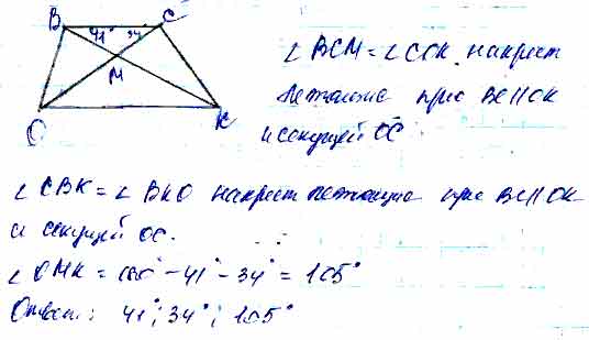 Для того чтобы дать полноценный ответ, был привлечен специалист, который хорошо разбирается требуемой тематике "ЕГЭ (школьный)". Ваш вопрос звучал следующим образом: В трапеции ОВСК с основаниями ВС и ОК диагонали пересекаются в точке М. Найдите углы треугольника МОК, если ∠KBC = 41°, ∠OCB = 34°.