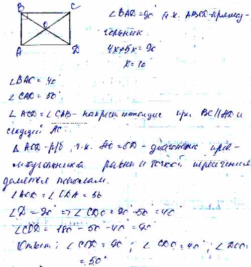 Для того чтобы дать полноценный ответ, был привлечен специалист, который хорошо разбирается требуемой тематике "ЕГЭ (школьный)". Ваш вопрос звучал следующим образом: В прямоугольнике ABCD диагональ АС делит угол BAD в отношении 4:5. Найдите углы треугольника COD (О — точка пересечения диагоналей).
