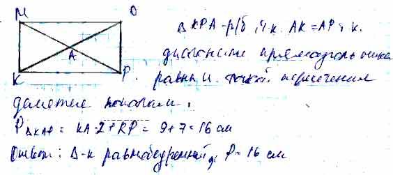 Для того чтобы дать полноценный ответ, был привлечен специалист, который хорошо разбирается требуемой тематике "ЕГЭ (школьный)". Ваш вопрос звучал следующим образом: Диагонали прямоугольника КМОР пересекаются в точке А, сторона МО равна 7 см, диагональ МР равна 9 см. Определите вид треугольника КРА (ответ обоснуйте) и найдите его периметр.
