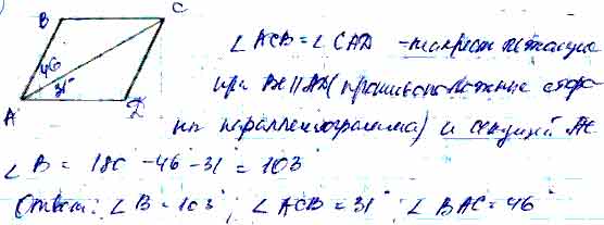 Для того чтобы дать полноценный ответ, был привлечен специалист, который хорошо разбирается требуемой тематике "ЕГЭ (школьный)". Ваш вопрос звучал следующим образом: Диагональ АС параллелограмма ABCD образует с его сторонами АВ и AD углы, равные 46° и 31°. Найдите углы треугольника ABC.
