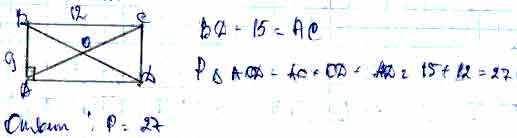 Для того чтобы дать полноценный ответ, был привлечен специалист, который хорошо разбирается требуемой тематике "ЕГЭ (школьный)". Ваш вопрос звучал следующим образом: Диагонали прямоугольника ABCD пересекаются в точке О. Найдите периметр треугольника AOD, если АВ = 9, ВС = 12, BD = 15.
