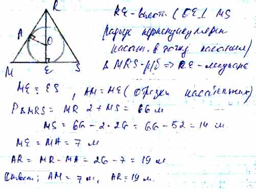 Для того чтобы дать полноценный ответ, был привлечен специалист, который хорошо разбирается требуемой тематике "ЕГЭ (школьный)". Ваш вопрос звучал следующим образом: Треугольник MRS — равнобедренный, его периметр равен 66 м, а основание MS равно 26 м. Найдите длины отрезков AM и AR (А — точка касания вписанной окружности со стороной MR).