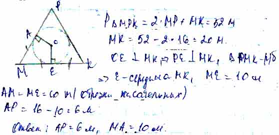 Для того чтобы дать полноценный ответ, был привлечен специалист, который хорошо разбирается требуемой тематике "ЕГЭ (школьный)". Ваш вопрос звучал следующим образом: Треугольник МРК — равнобедренный, его основание МК равно 16 м, а периметр равен 52 м. Найдите длины отрезков AM и АР (А — точка касания вписанной окружности со стороной МР).