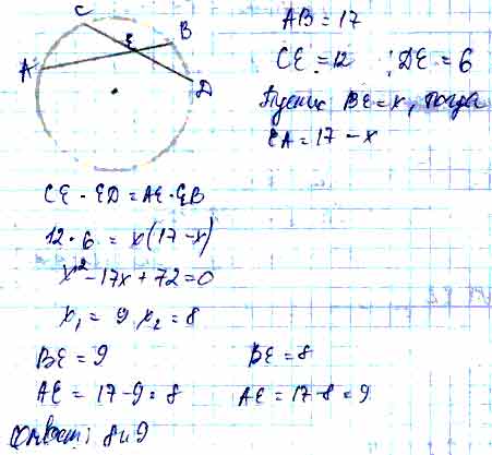 Для того чтобы дать полноценный ответ, был привлечен специалист, который хорошо разбирается требуемой тематике "ЕГЭ (школьный)". Ваш вопрос звучал следующим образом: Хорды АВ и CD пересекаются в точке Е. Найдите длины отрезков АЕ и BE, если АВ = 17, СЕ = 12, DE = 6.