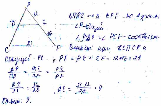 Для того чтобы дать полноценный ответ, был привлечен специалист, который хорошо разбирается требуемой тематике "ЕГЭ (школьный)". Ваш вопрос звучал следующим образом: В трапеции CDEF (CF — большее основание) боковые стороны продолжены до пересечения в точке Р. Найдите основание DE, если CF = 21, EF = 16, РЕ = 12.